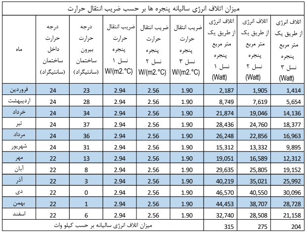 با مراجعه به جداول فوق مشخص خواهد شد که در صورت انتخاب پنجره های نسل دوم سالیانه ۴۰ کیلو وات به نسبت هر متر مربع و در صورت انتخاب پنجره های نسل سوم ۱۱۱ کیلو وات بازای هر متر مربع پنجره در سال صرفه جویی خواهد شد.